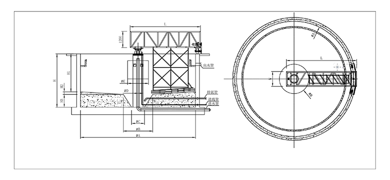 工作橋由安裝在周邊的驅動機構帶動,繞安裝在池中心支墩上的中心支座旋轉。懸掛在工作橋下的刮臂拖動對數螺旋線刮泥板旋轉,沉淀在池底的污泥由刮泥板收集至中央集泥坑。液面上的浮渣在浮渣刮板和周邊擋渣板形成的漸縮區域內集中,由浮渣刮耙扒到集渣斗,排出池外。