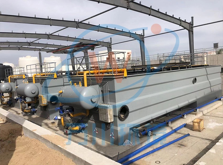 WF型組合氣浮設備是由氣浮池體、溶氣系統、溶氣水回流管路、溶氣水釋放裝置、刮渣機和電控系統組成。